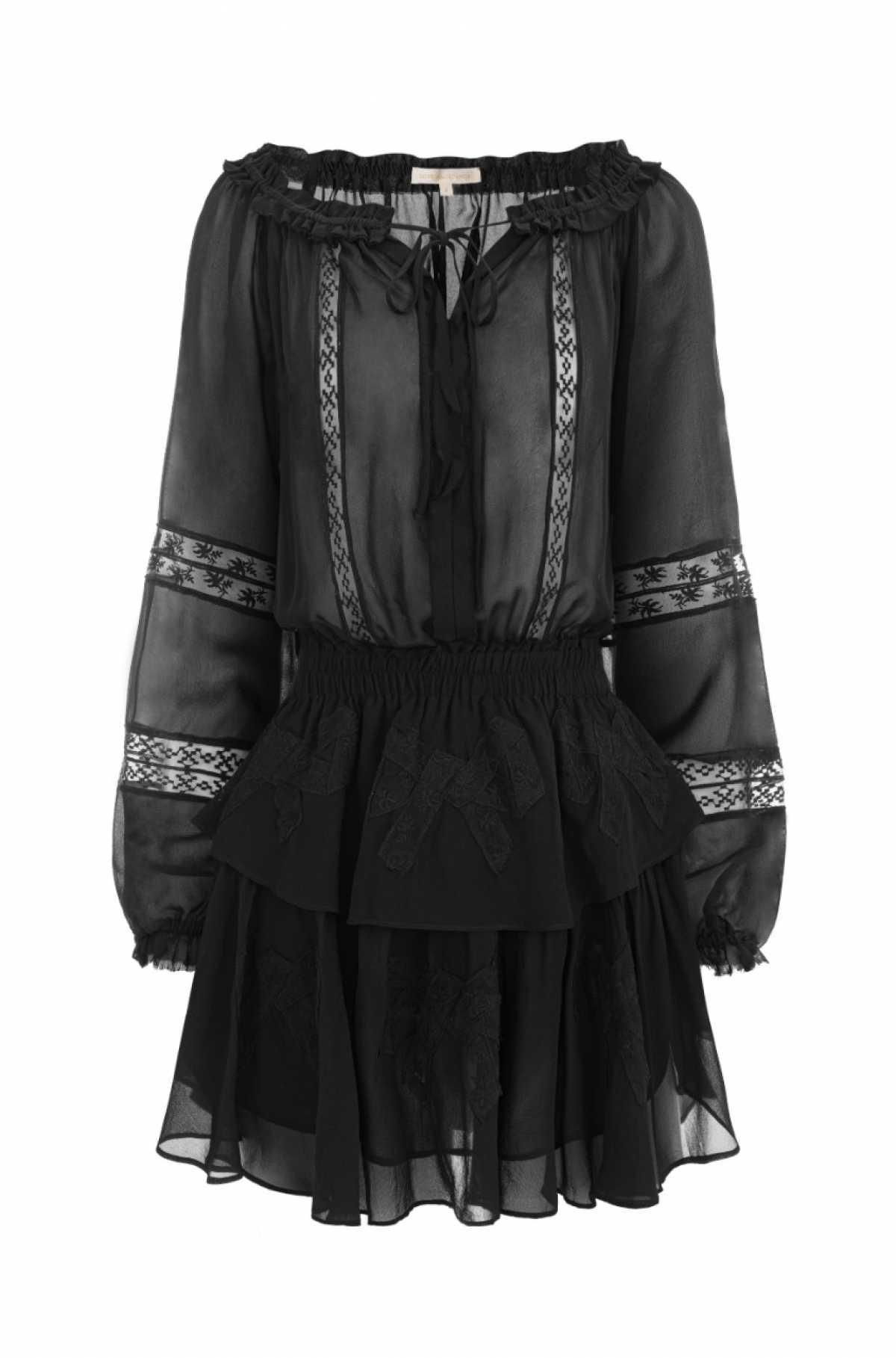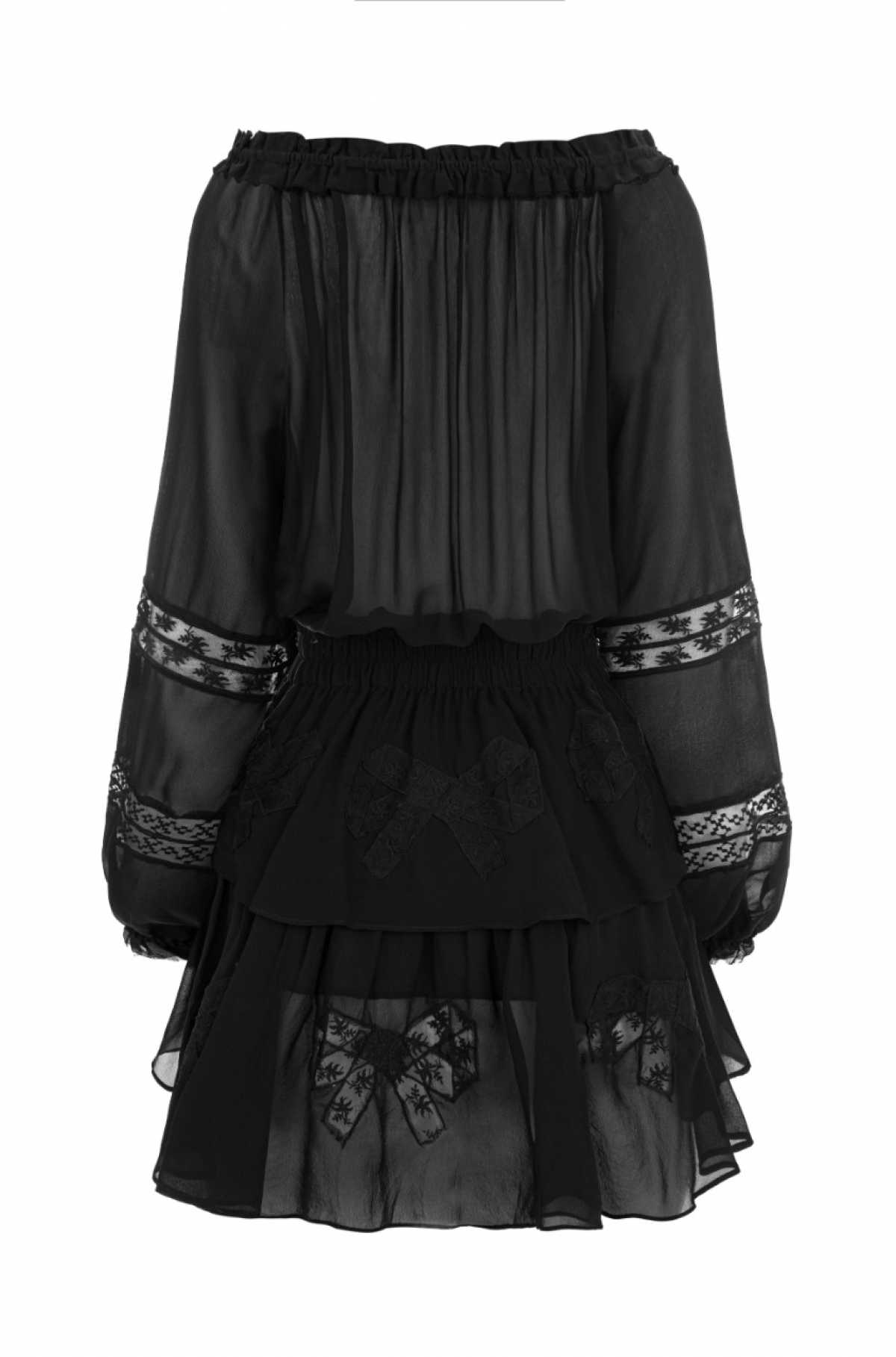 Mini sukienka, jedwabna w czarnym kolorze. Dopasowana w talii, dekolt regulowany za pomocą troczków, długie bufiaste rękawy, spódnica wykończona warstwową falbaną.