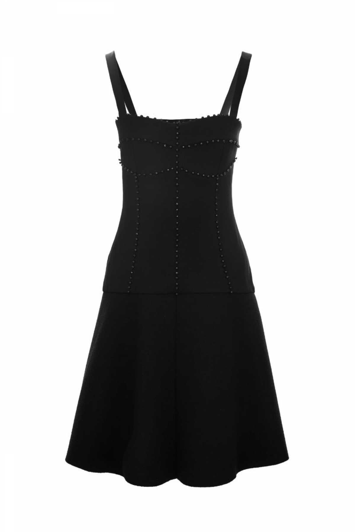 Sukienka czarna, zdobiona kamieniami rozłożonymi geometrycznie na karczku, na ramiączkach z rozkloszowanym dołem.