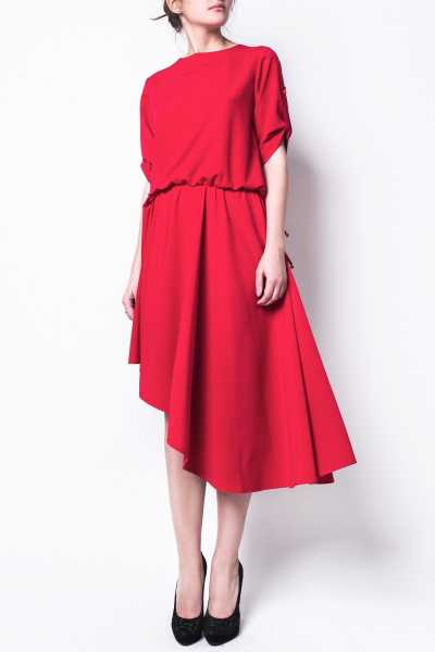 Asymetryczna sukienka w odcieniu ognistej czerwien.