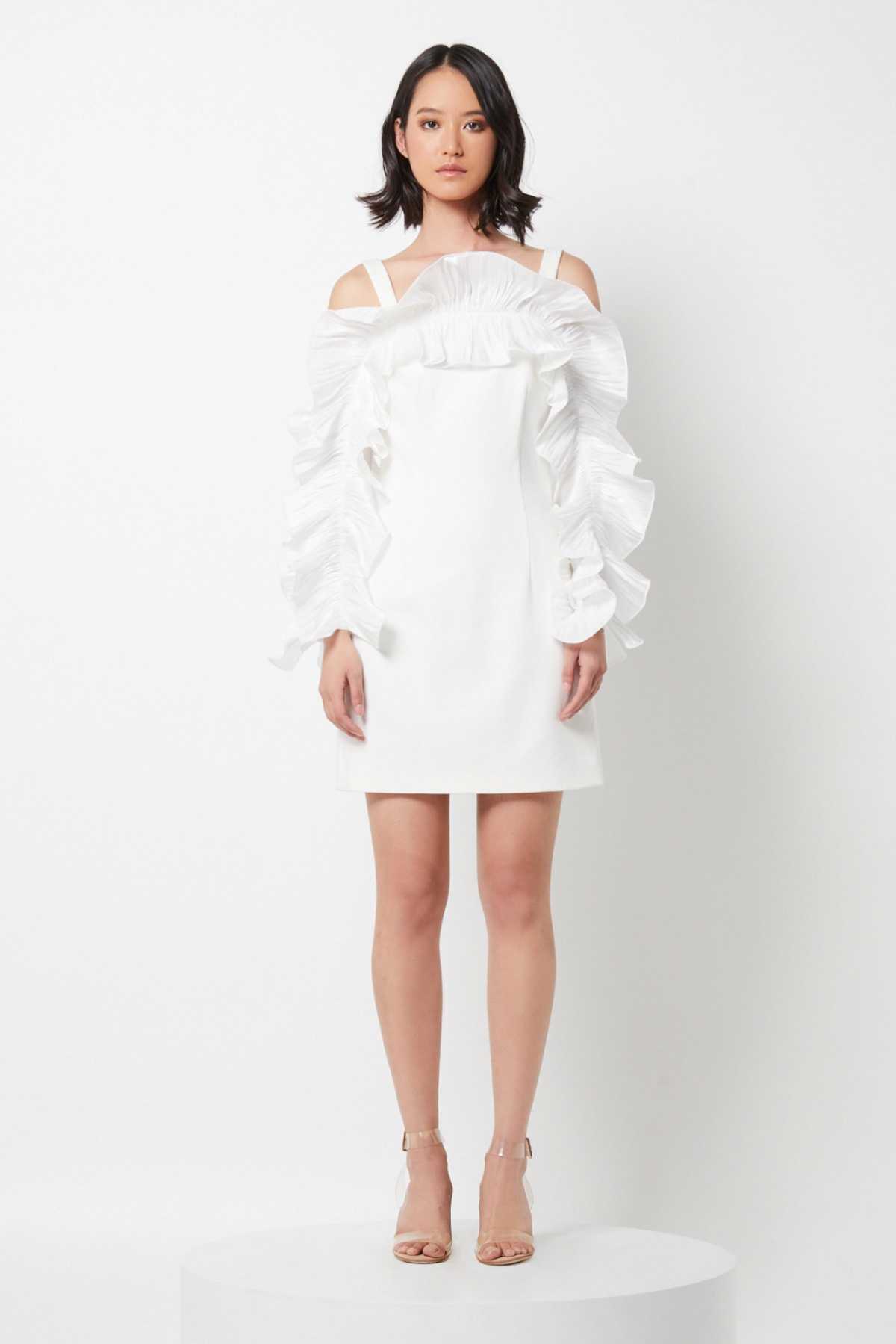 Bardzo kobieca, biała sukienka mini ze zdobionymi falbaną rękawami. Dodatek falbanek podkreśla ekstrawagancję tej kreacji. Idealna zarówno na dzień, jak i na wieczór. Wypożycz na randkę, urodziny, imprezę lub inną ważną okazję. Noś ze złotymi dodatkami lub perłami. Duże kolczyki to idealne dopełnienie tej sukienki.