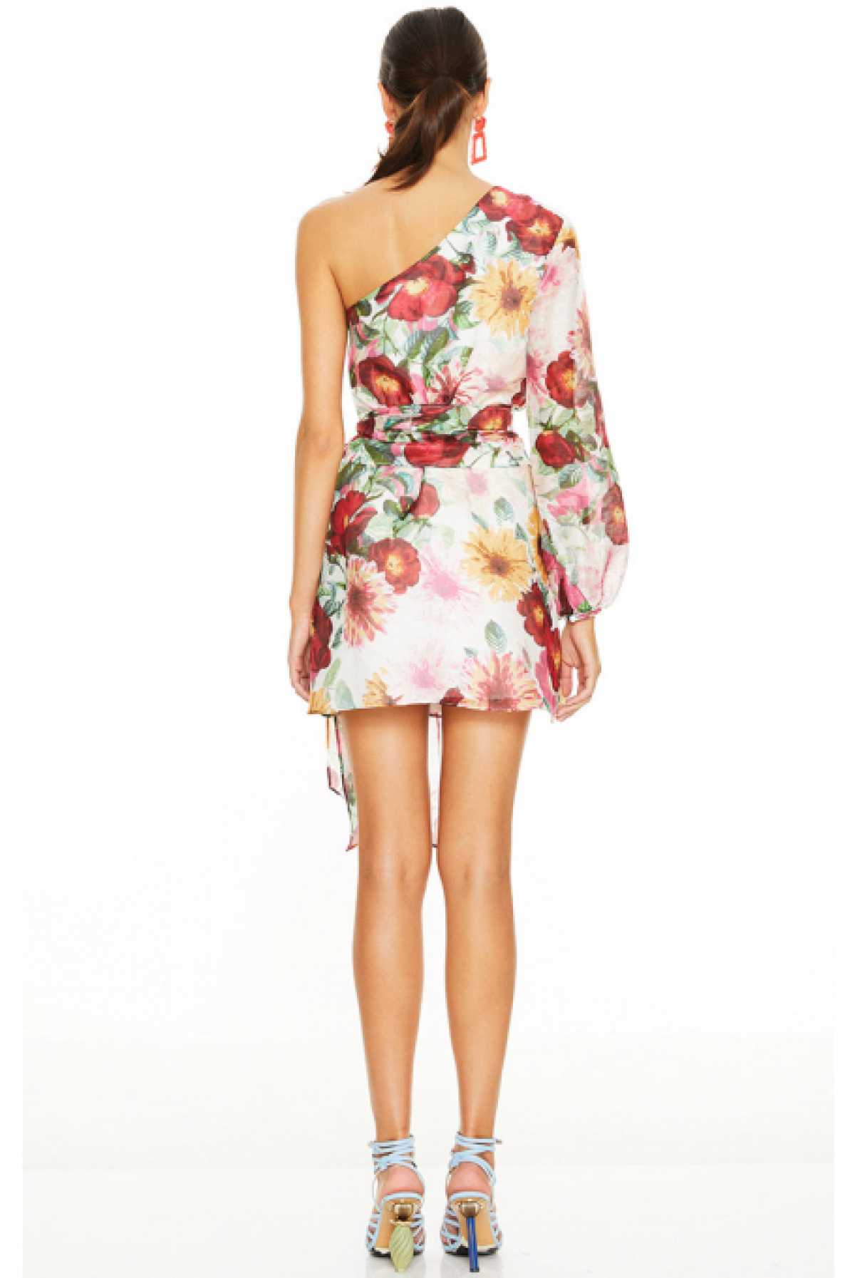 Zwiewna i delikatna sukienka z asymetrycznym dekoltem będzie idealną kreacją na romantyczną randkę, letnią imprezę, czy przyjęcie okolicznościowe. Ultralekka tkanina w kontrastowy wzór nadaje charakteru całości, kojarząc się ze wspomnieniem gorącego lata. Odsłonięte ramię dodaje seksapilu jednocześnie wysmuklając sylwetkę. Szeroki pas dodatkowo podkreśla talię, pozostawiając swobodę w wyborze sposobu wiązania.