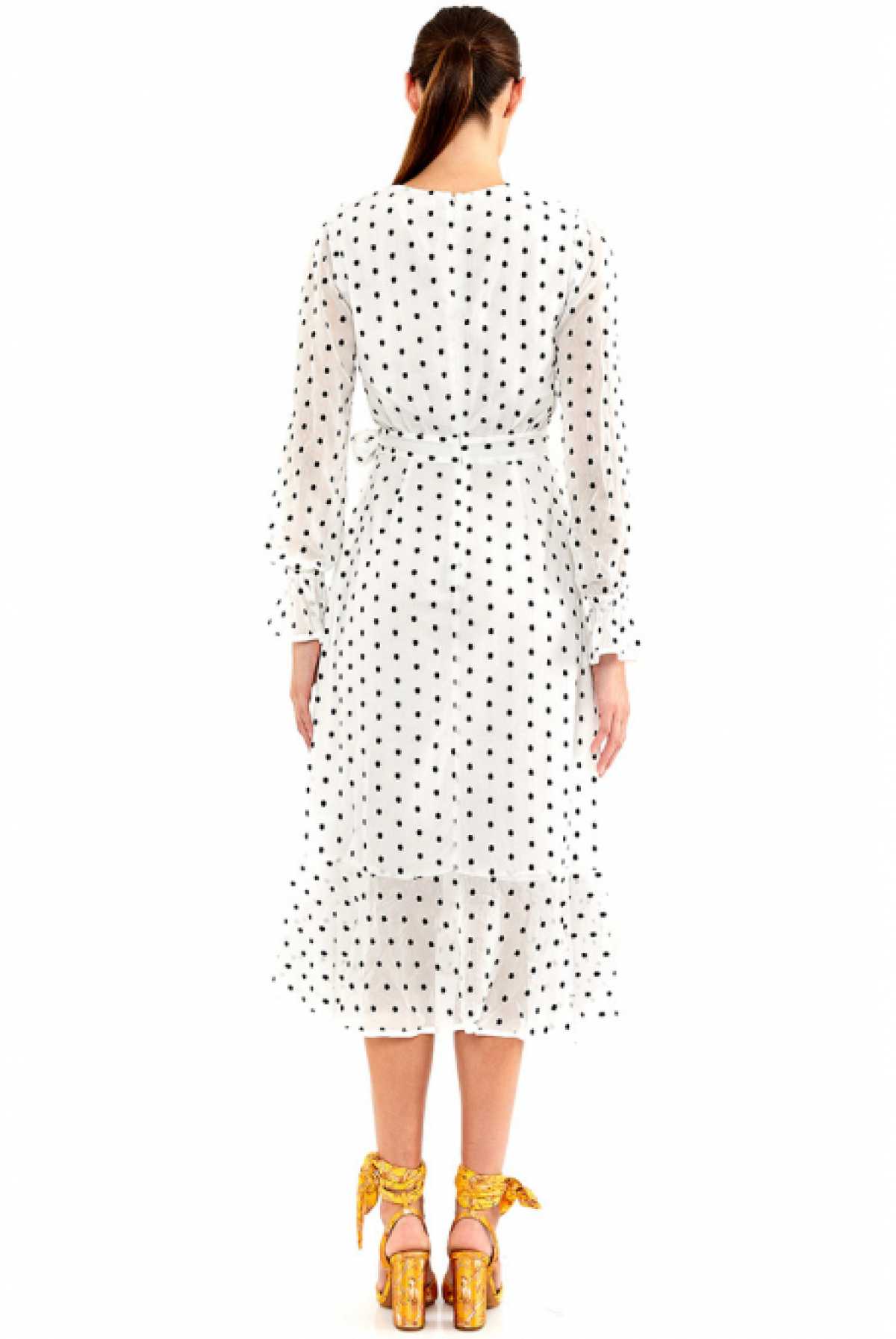 Sukienka w grochy nawiązująca do stylu lat 60 i 70. Wiązany, kopertowy krój pięknie podkreśla talię, a falbany w dolnej części subtelnie dodają uroku całości. Groszki to jeden z najmodniejszych printów w tym sezonie, który pokochały wszystkie influencerki! Ten model niewątpliwie świetnie wpisuje się w aktualne trendy wakacyjne i instagramowe.