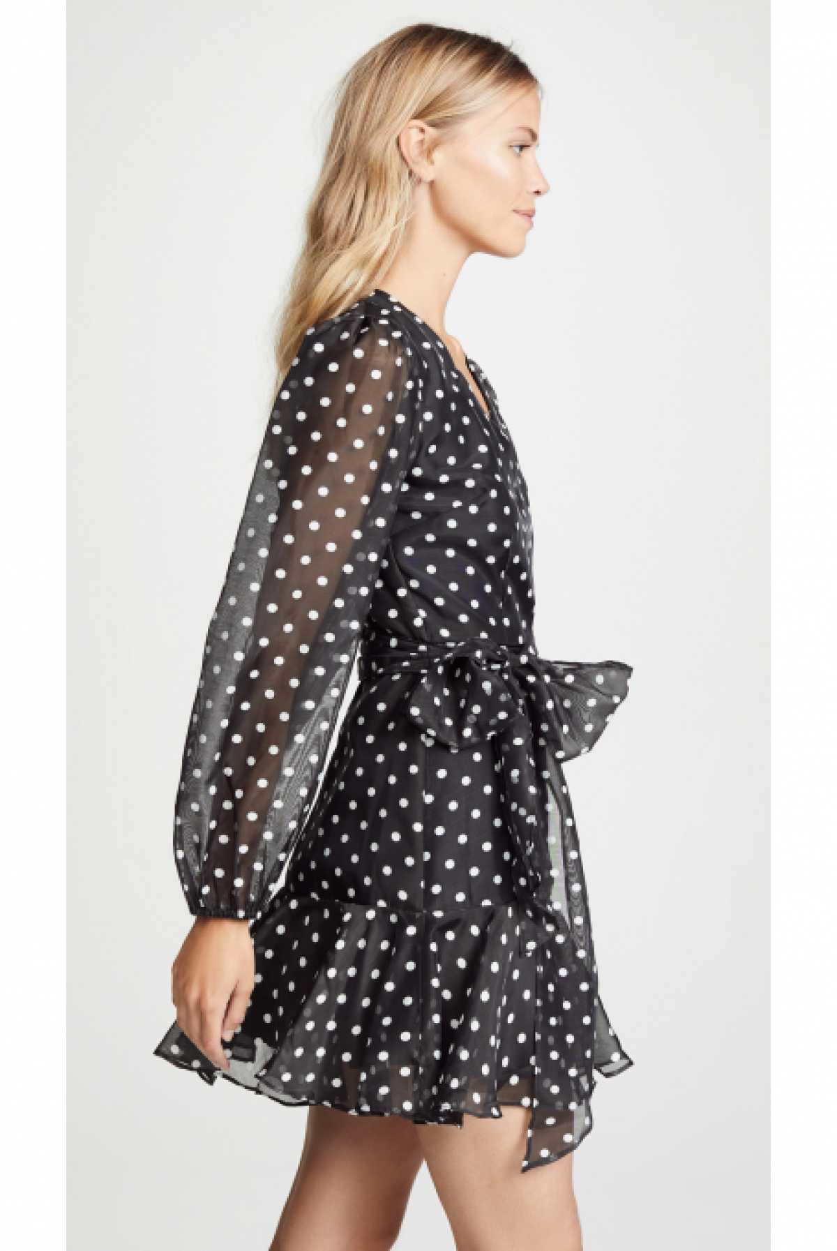 Niezwykle urocza i zwiewna mini sukienka w grochy - najmodniejszy retro-print tego sezonu! Można ją nosić luźną bądź z paskiem zawiązanym w talii w kokardę. Wykończona romantyczną falbanką zachwyca od pierwszego wejrzenia. Jest to doskonały wybór na niemal każdą okazję, aby poczuć się w pełni kobieco