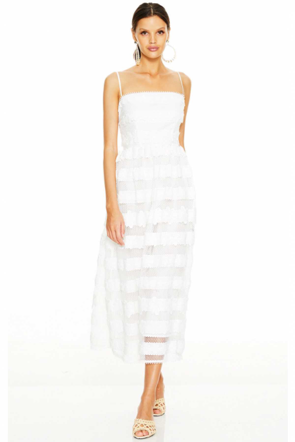 Oryginalna sukienka midi na cienkich ramiączkach składająca się z dwóch warstw. Warstwa wewnętrzna to sukienka mini a warstwa wewnętrzna to ozdobna część podzielona na haftowaną górę z kwiatów i długa lekko przezroczystą spódnicę w paski z kwiatów. Ten ciekawy projekt i przepiękna propozycja marki Maison Talulah skierowany jest do kobiet, które szukają prawdziwych pereł pośród sukienek i nie lubią nudnych rozwiązań. Sukienka będzie doskonałą propozycją na slub cywilny, poprawiny, baby shower jak i również gale.
