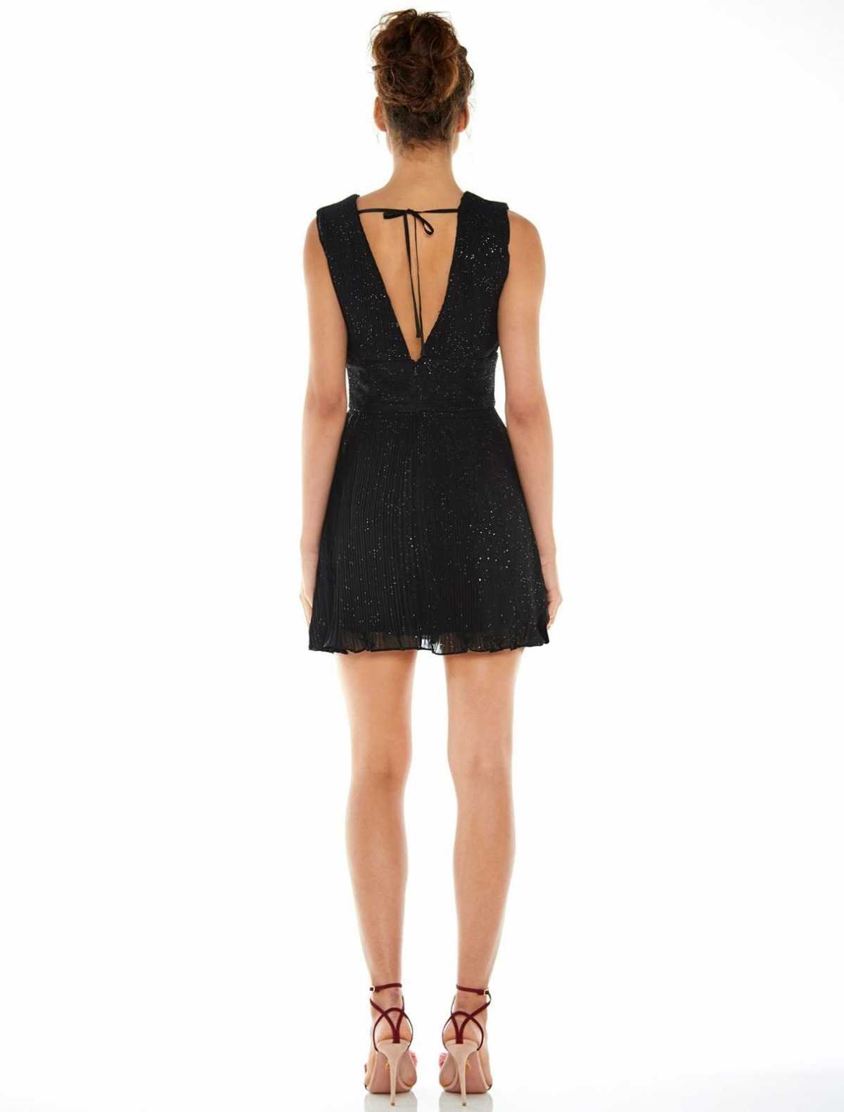 Delikatnie plisowana czarna mini sukienka z mocnym rozcięciem na dekolcie i plecach. Subtelnie opruszona mieniącym się brokatem. Niby klasycznie, ale z pazurem. Aby stworzyć ciekawą stylizację możesz ją zestawić z marynarką oversize i dużą biżuterią.