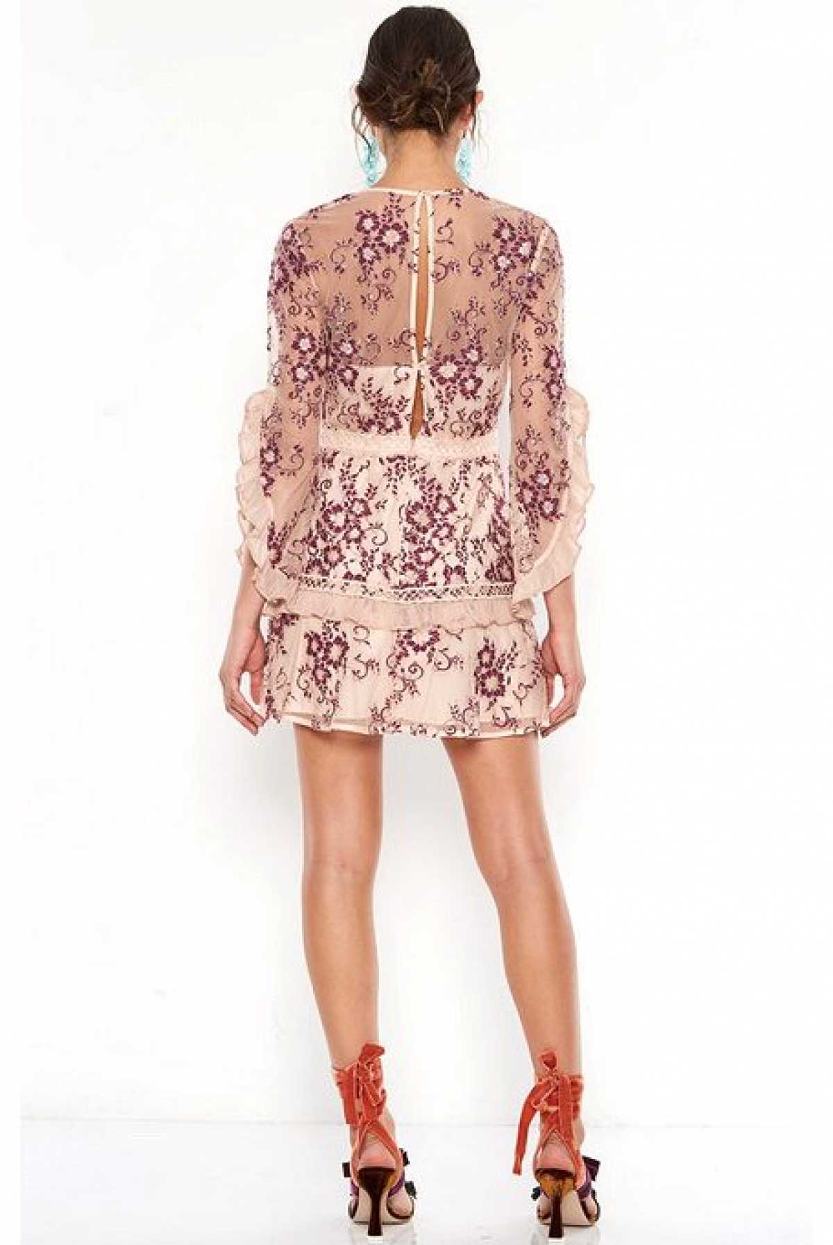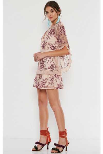 Zalotna, koronkowa mini sukienka z rozkloszowanych rękawami z ozdobnymi wykończeniami i dekoltem w kształcie litery V. Jeżeli stawiasz na świeży, dziewczęcy look ta sukienka jest właśnie dla Ciebie. Założysz ją na imprezy okolicznościowe czy przyjęcia koktajlowe.