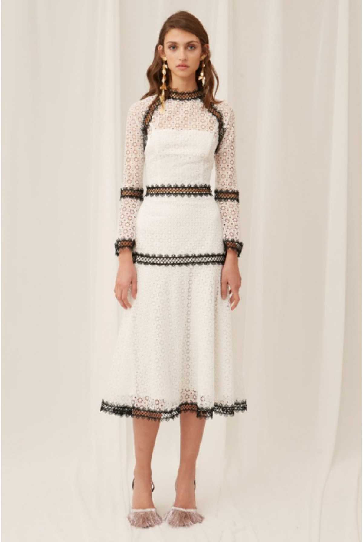 Koronkowa kreacja midi w bieli z czarnymi akcentami. Trapezowy fason sukienki ma ważną zaletę – pasuje właściwie do każdej sylwetki. Subtelna stójka i koronka będąca wykończeniem sukienki podkreśla jej romantyczny charakter. Jesteśmy pewni, że zakochasz się w tej kreacji!