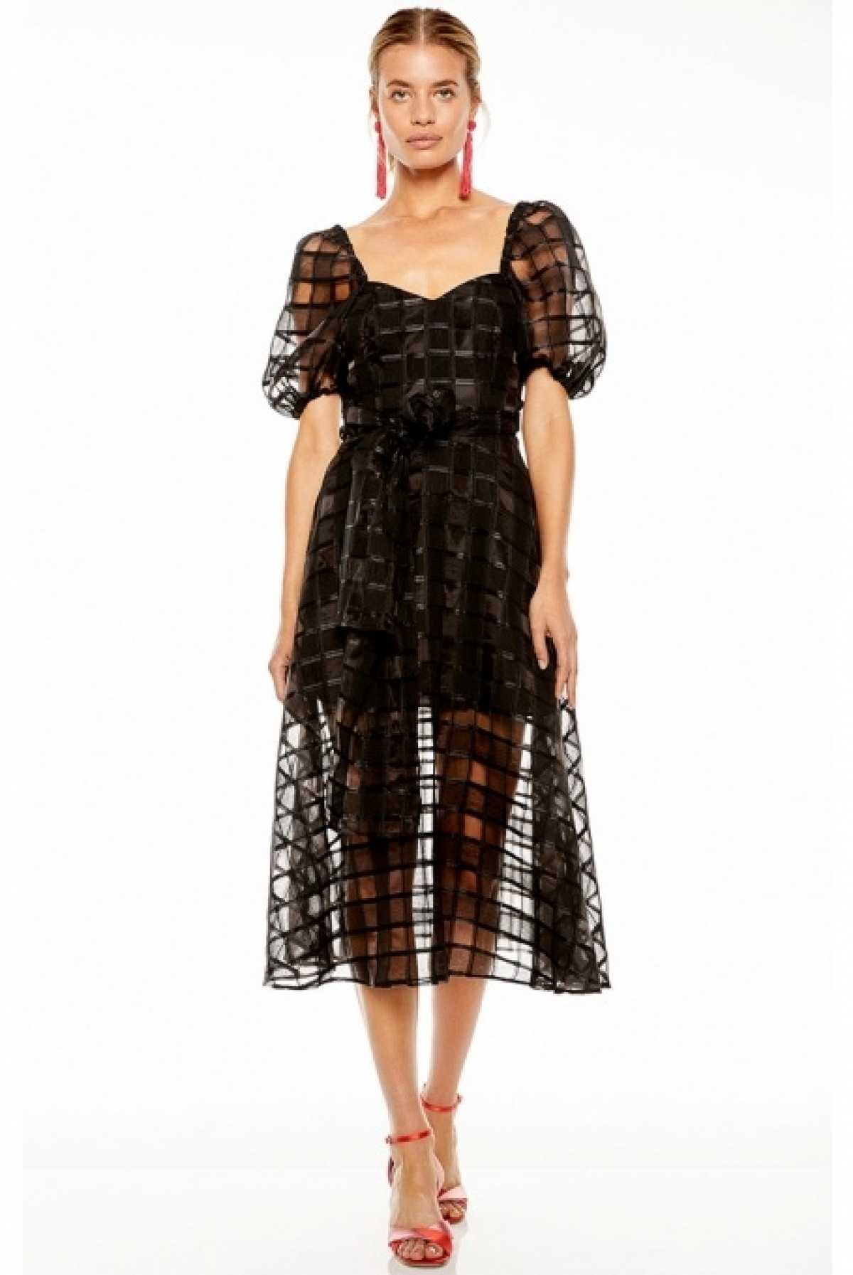 Sukienka midi o nowoczesnym kroju, która przypadnie do gustu każdej fashionistce! Intensywnie głęboka czerń i półprzezroczysta, siateczkowata faktura sprawia, że jest to idealna propozycja na elegancki wieczór. Okrągłe bufki nawiązują do stylu retro, a wiązany pasek świetnie podkreśla talię. Jeśli lubisz klasyczne i stylowe sukienki, ale z nutką szaleństwa - to jest to kreacja właśnie dla Ciebie.