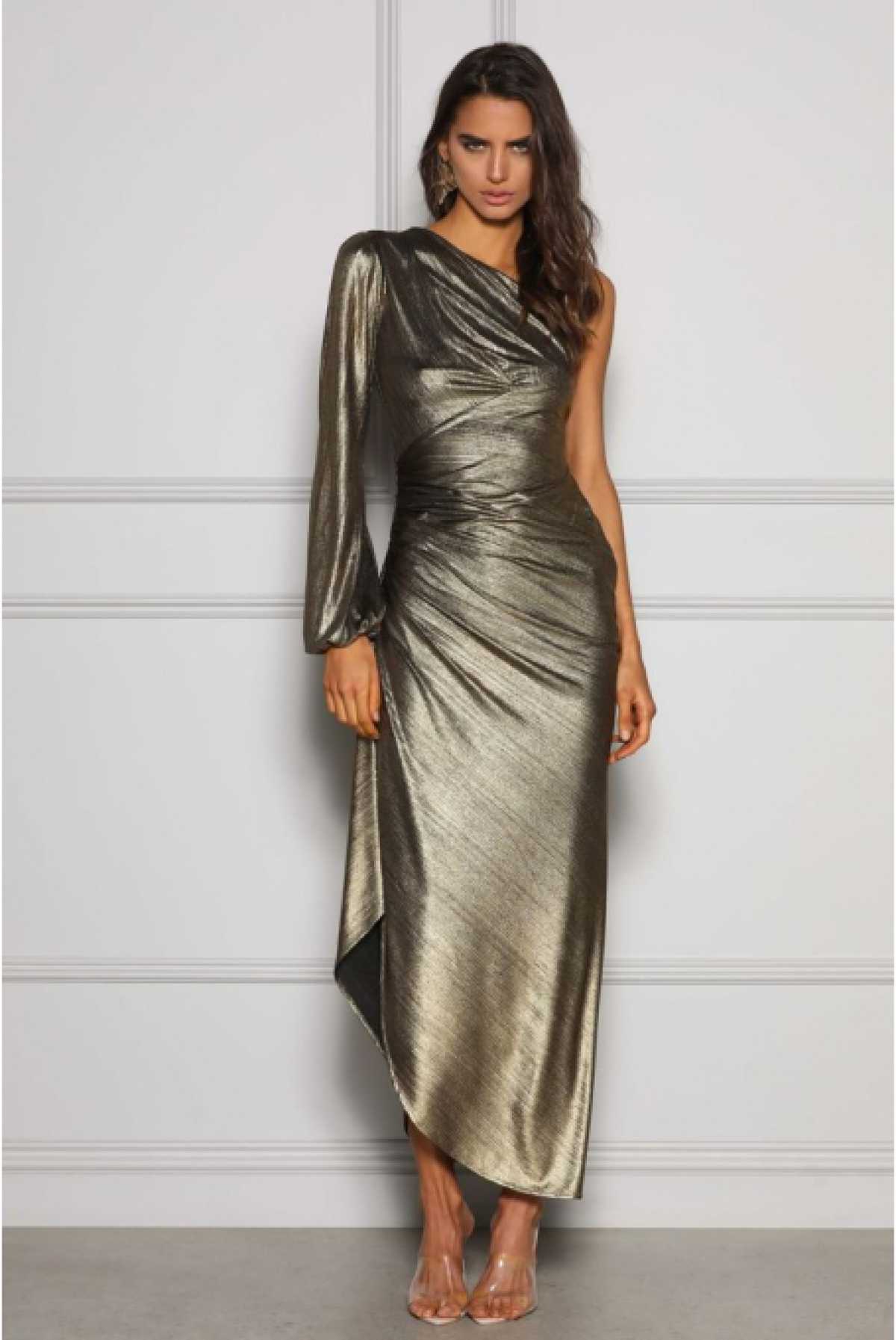 Drapowana, złota suknia wieczorowa na jedno ramię. To kreacja na miarę czerwonego dywanu w stylu Hollywood. Świetnie komponuje się z opaloną skórą. Wypożycz na galę, event, urodziny oraz inne okazje, podczas których pragniesz wyglądać jak gwiazda. Faktura materiału stwarza wrażenie olśniewającej taflii.
