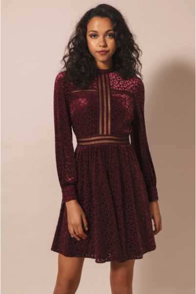 Bordowa sukienka mini z motywem zwierzęcym, długim rękawem, ozdobnymi taśmowymi przeszyciami i rozkloszowanym dołem prezentuje się świetnie na wszystkich typach sylwetki. Nie tylko pięknie podkreśla talię ale pomaga ukryć małe niedoskonałości, dlatego właśnie uznawana jest za najlepszą przyjaciółkę każdej kobiety. Ze względu na zwierzęcy print, który dodaje sukience charakteru warto przemyśleć dobór dodatków, które również wpływają na efekt końcowy stylizacji. Wypożycz sukienkę na przyjęcie, kolację biznesową czy randkę.