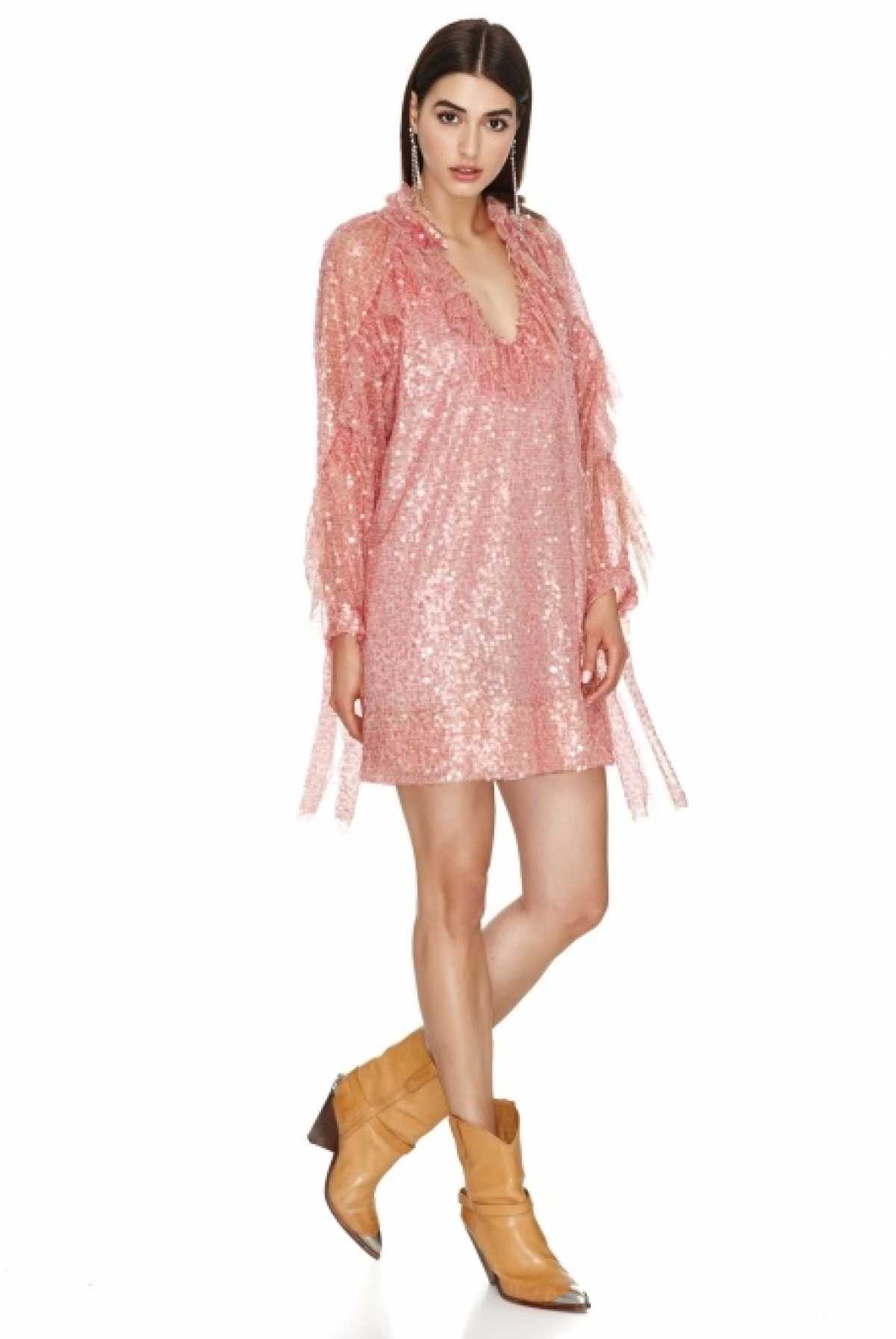 Cekinowa, oversizowa mini to niezwykła ozdoba kobiecego ciała. Przepiękny odcień różu , szerokie rękawy oraz ozdobne falbanki to idealne uzupełnienie tej zjawiskowej sukienki, dzięki której odmienisz swój wizerunek na imprezie czy podczas randki. Cekinowa sukienka nie jest zarezerwowana tylko na wieczór. Pamiętaj jednak, by dopasować odpowiednie dodatki, w przeciwnym razie możesz wyglądać zbyt groteskowo.
