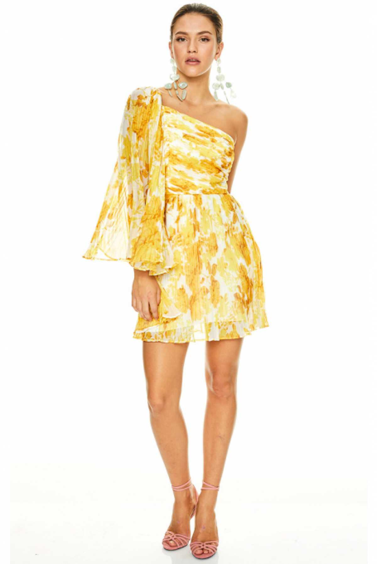 Słoneczna i wyjątkowo radosna sukienka mini w kwiaty na jedno ramię. W szczególności pasuje do opalonej karynacji i brunetek. Kwiaty niczym malowane akwarelami kojarzą się z latem i wakacjami. W tej sukience z pewnością zyskasz dobry nastrój i poczujesz się bardzo kobieco. Lekko plisowany materiał, 100% jedwab.