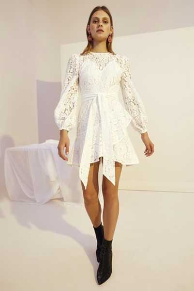 Koronkowa mini sukienka z bufiastymi rękawami. Asymetryczna falbana i delikatne wiązanie w talii przypadną do gustu każdej kobiecie o duszy romantyczki. Krój sukienki podkreśli Twoje nogi i talię, a koronka doda dziewczęcego uroku i powabności.
