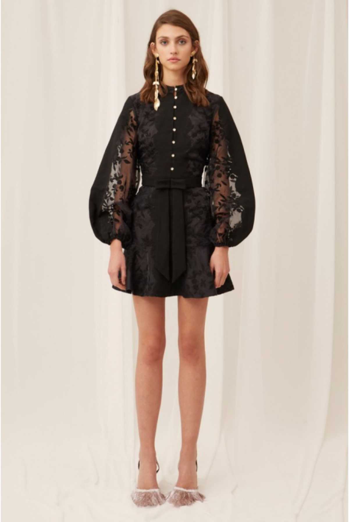 Czarna mini z bufiastymi rękawkami i elementami przezroczystości. Przepięknie haftowany materiał sprawia wrażenie dzieła sztuki. Ciekawym akcentem są eleganckie guziczki przy dekolcie oraz wiązana kokarda w talii. Noś z dodatkami w odcieniach srebra lub złota.