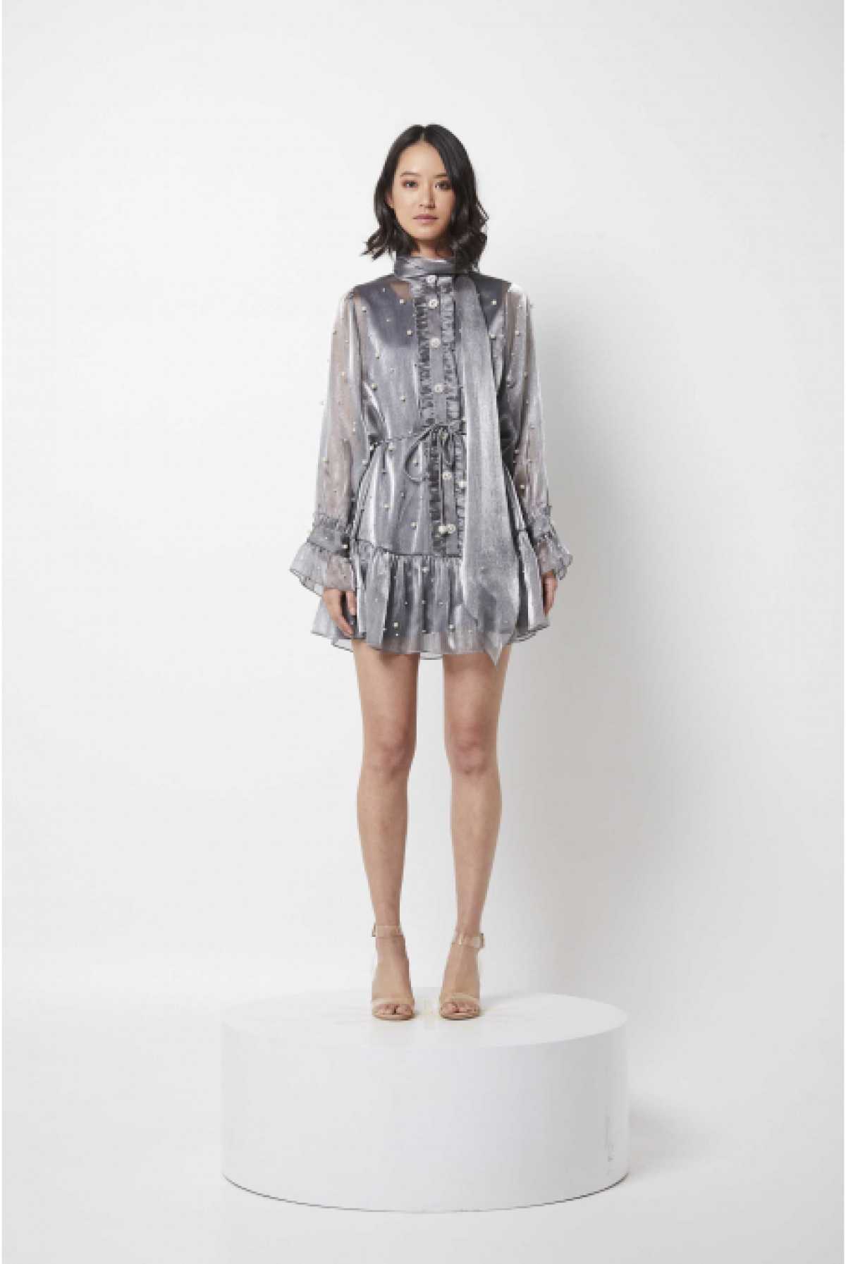 Przepiękna, romantyczna i niezwykle oryginalna srebrna sukienka to bez wątpienia idealna propozycja na wesele, przyjęcie urodzinowe, romantyczną kolację czy event. Zdobienia perłami, szarfa, rozkloszowana spódnica z falbanką oraz zdobiony pas dodają sukience charakteru. Sukienka doda Ci lekkości i sprawi, że poczujesz się wyjątkowo bawiąc się modą i wykorzystując jej potencjał na wiele sposóbow. Możesz założyć do niej zarówno szpilki jak i sandałki czy też botki.