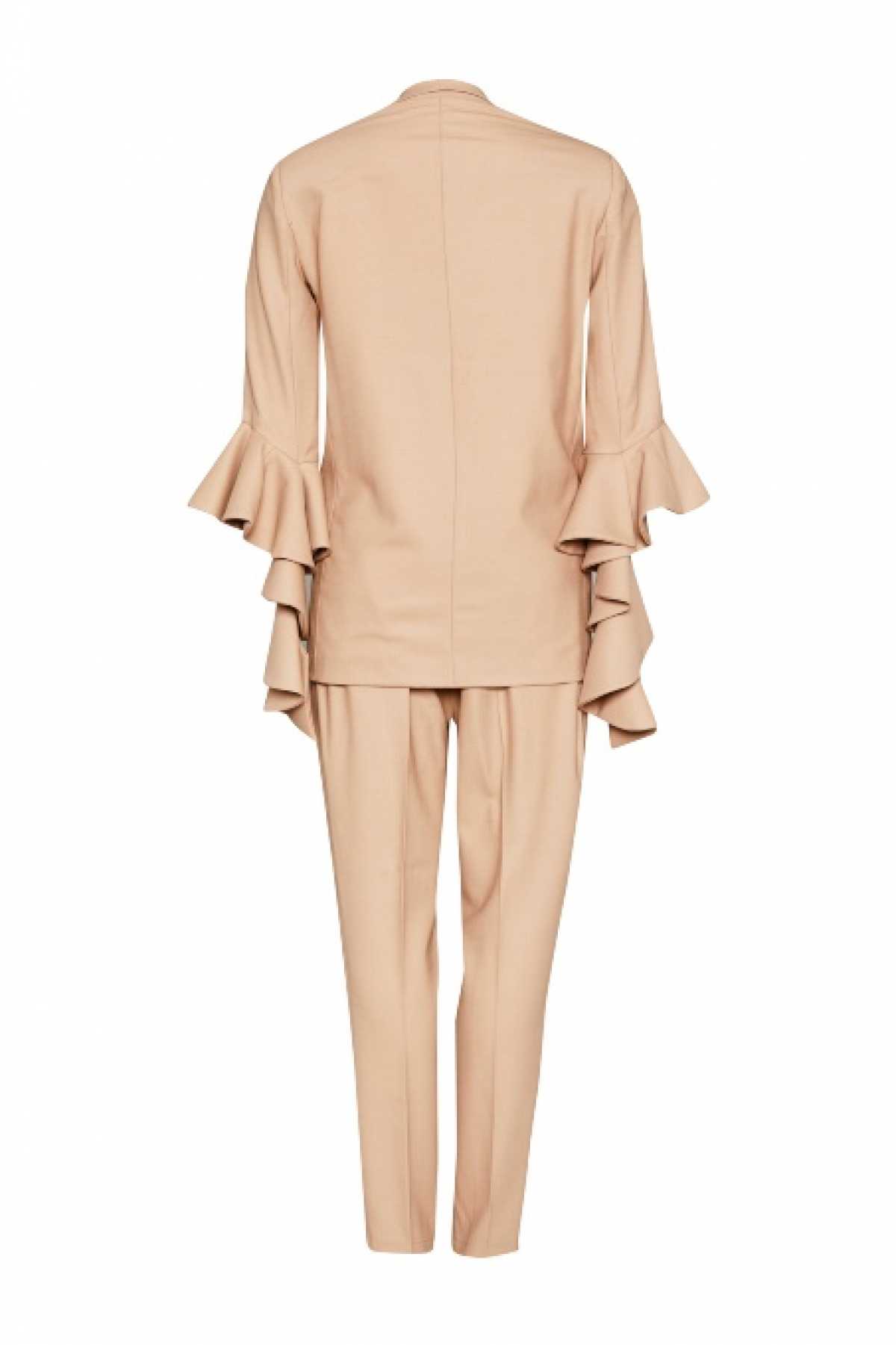 Klasyczne, garniturowe, wąskie spodnie w kolorze piaskowym to uniwersalne rozwiązanie, które sprawdza się w przypadku zarówno eleganckich jak i codziennych stylizacji. Można je łączyć nie tylko z eleganckimi częściami garderoby ale pozwolić sobie na rozwiązania bardziej sportowe czy ekstrawaganckie. Wypożycz w zestawie z marynarką.