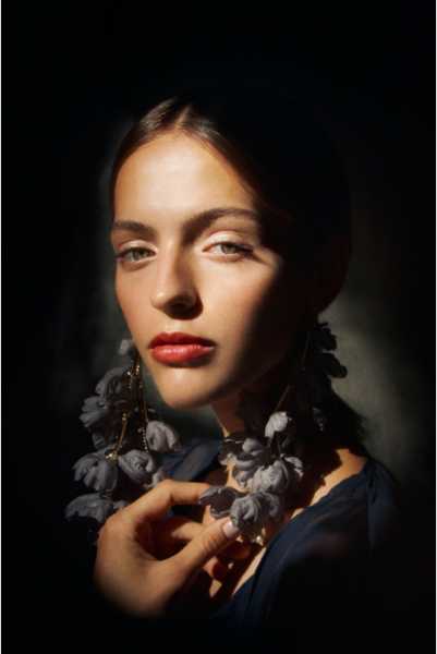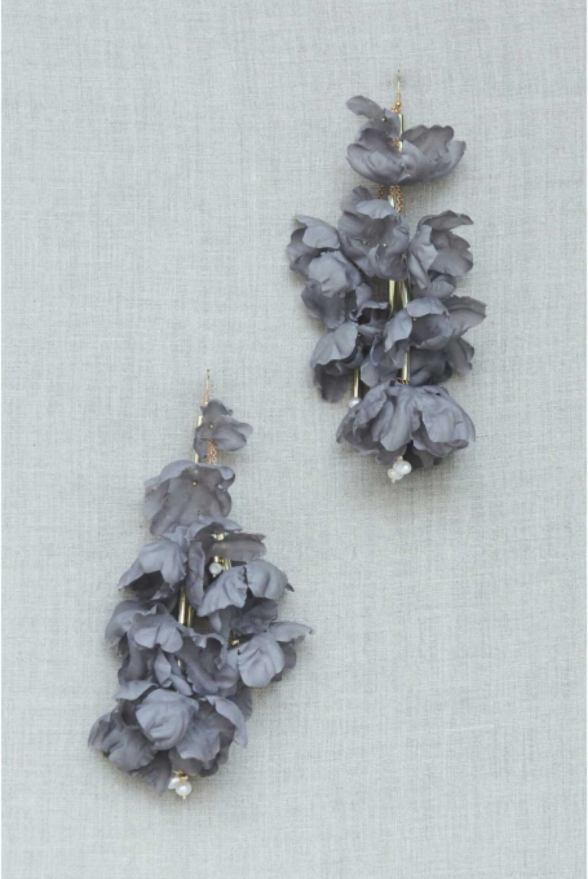 Duże i awangardowe kolczyki wykonane z jedwabiu i pereł słodkowodnych w kolorze jasnej szarości. Ręcznie wykonane jedwabne kwiaty mocowane na mosiężnych łańcuszkach