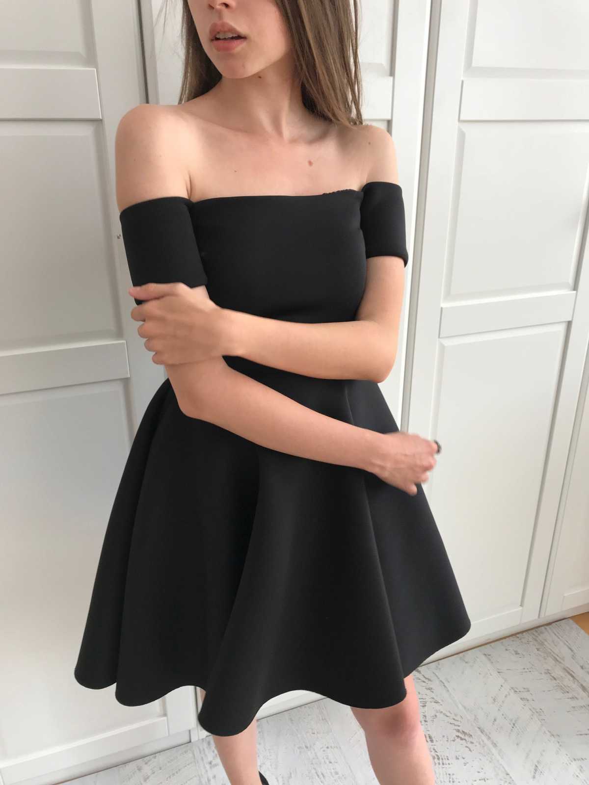 „Mała czarna” z rozkloszowanym dołem i odkrytymi ramionami. Dekolt w stylu hiszpańskim. Sukienka z materiału typu „pianka”, nie gniecie się i trzyma fason. Elastyczna.