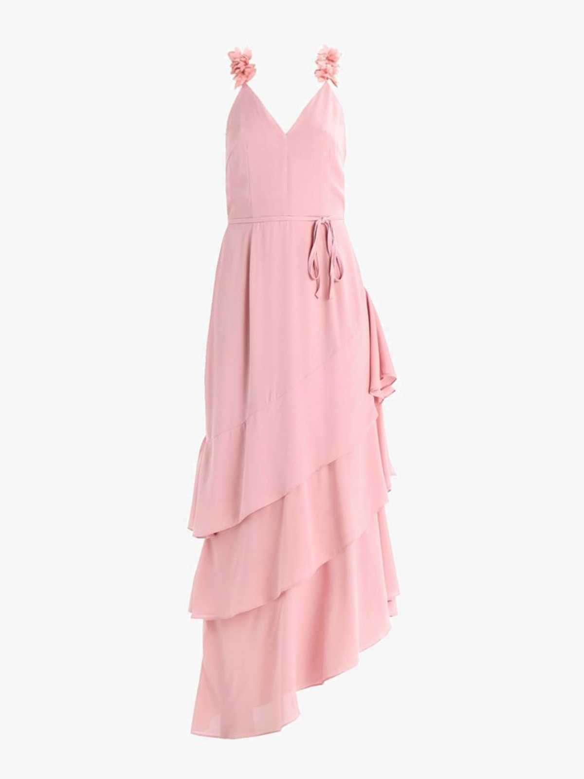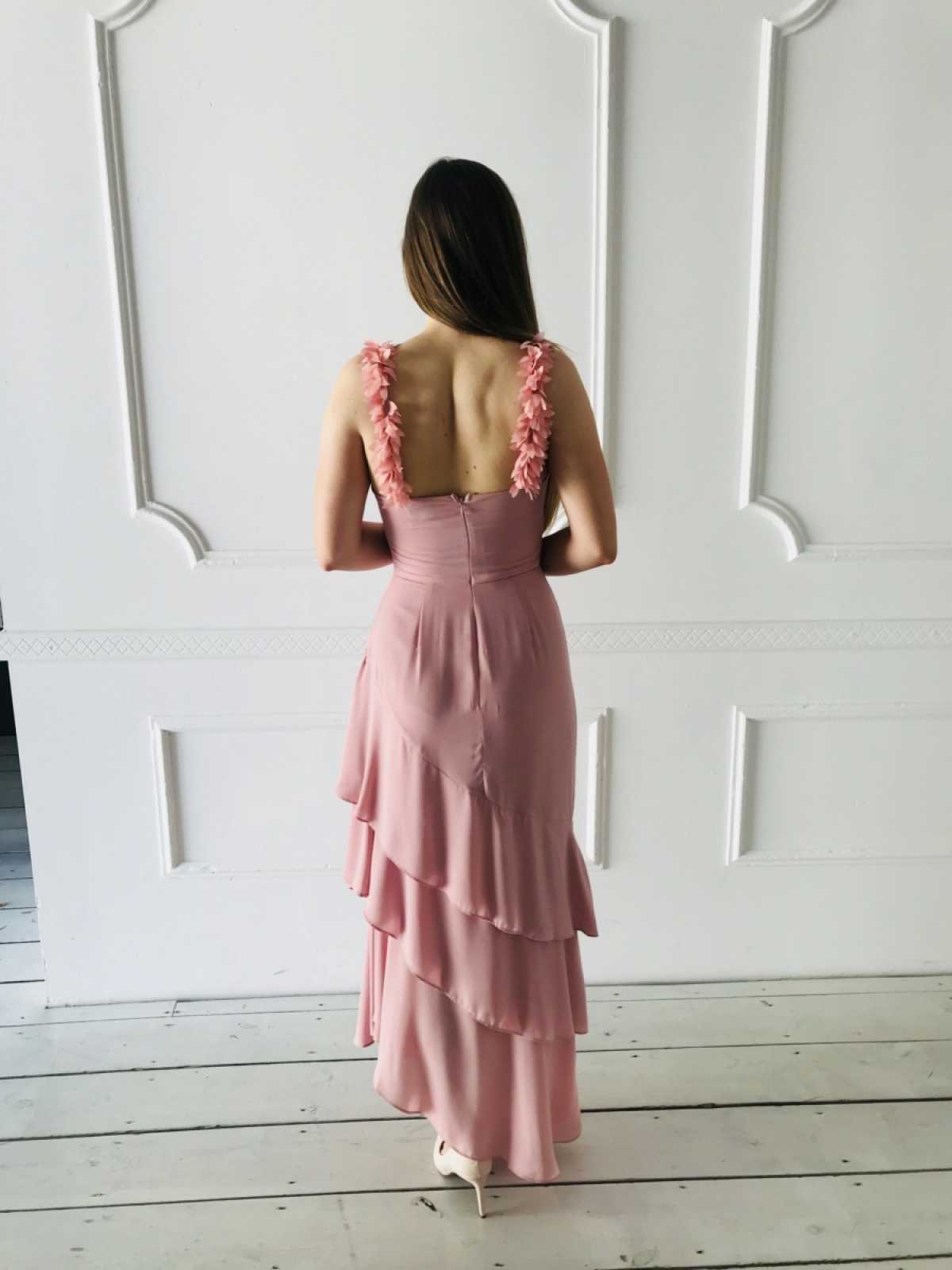 Romantyczna różowa sukienka z falbankami na ramiączkach. Ozdobne wiązanie z boku. Idealna dla druhny albo na romantyczną randkę. Szerokość w klatce piersiowej: 41 Szerokość w talii: 33 Długość: 157 Skład: 100% poliester Rozmiar: S