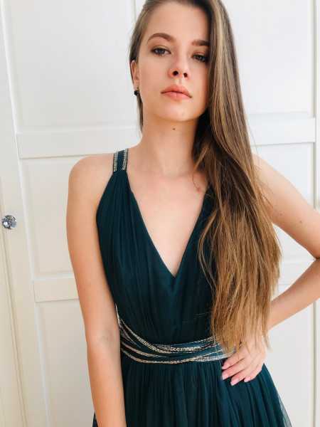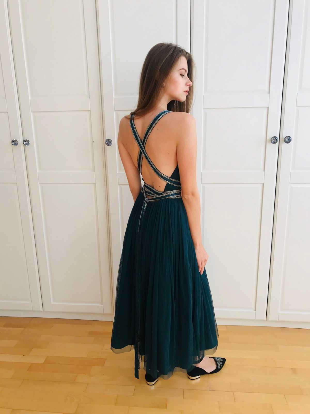 Tiulowa sukienka z halką. Rozkloszowana do kostek, odkrywająca plecy, wiązana z tyłu. Idealna na wesele, bal albo wieczorne wyjście.