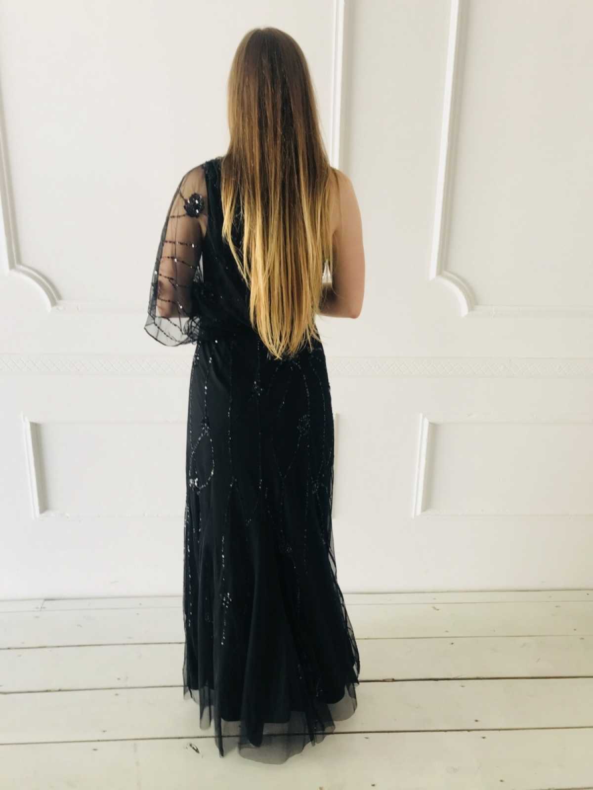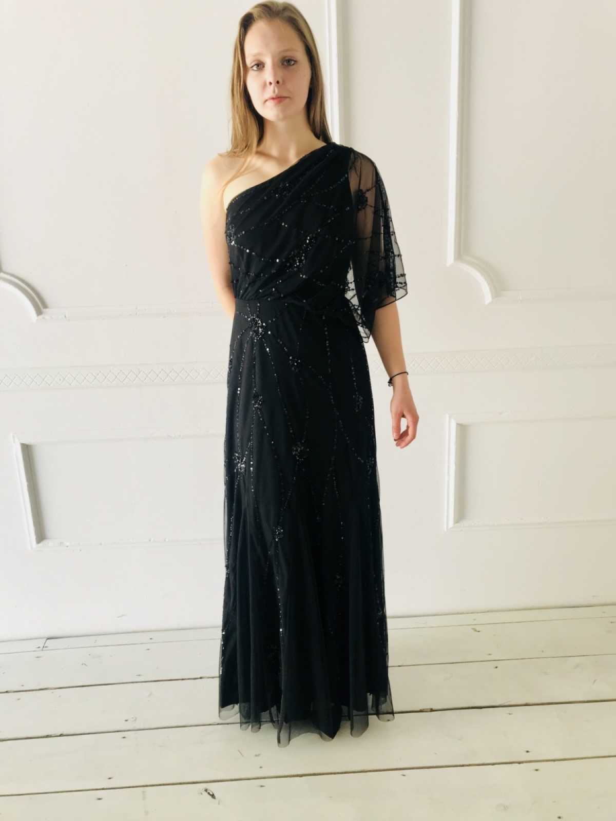Czarna balowa kreacja ozdobiona tiulem i cekinami. Dwuwarstwowa idealnie kryje niedoskonałości figury. Długość maxi. Szerokość w klatce piersiowej: 41 Szerokość w talii: 35 Długość: 158 Skład: 100% poliester Rozmiar: M