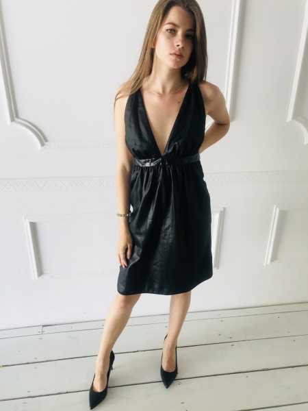 Czarna sukienka z odkrytymi plecami i błyszczącym paskiem. Dołem rozszerzana, nad kolano. Idealna na randkę albo na wieczór panieński.