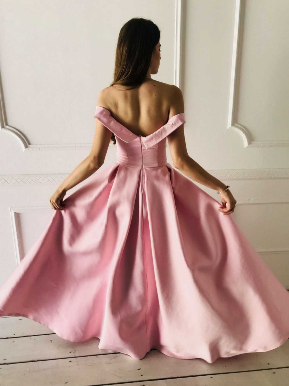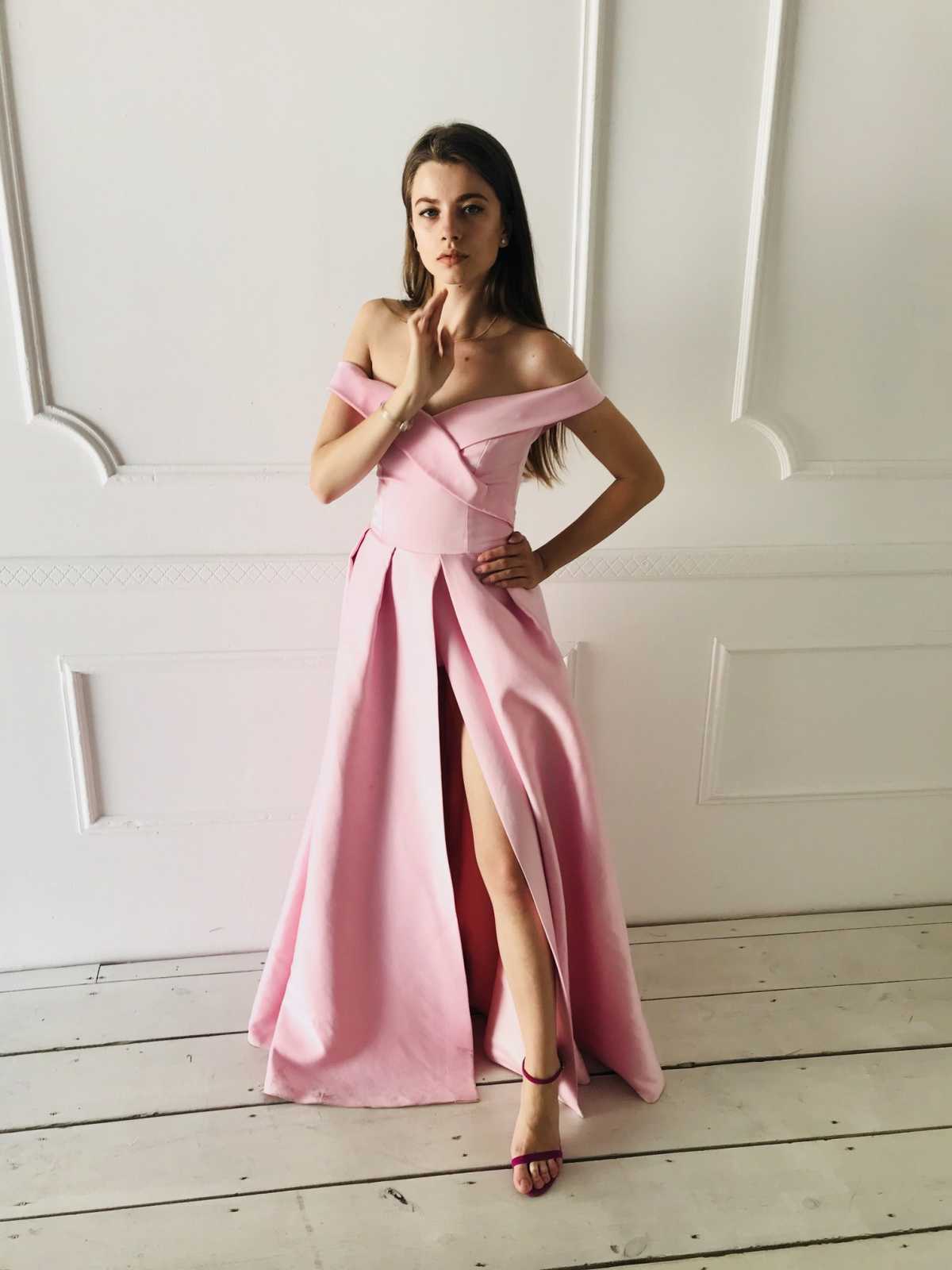Balowa suknia z tafty z podszewką, z połyskiem. Dołem rozkloszowana, z długim rozcięciem eksponującym nogę.