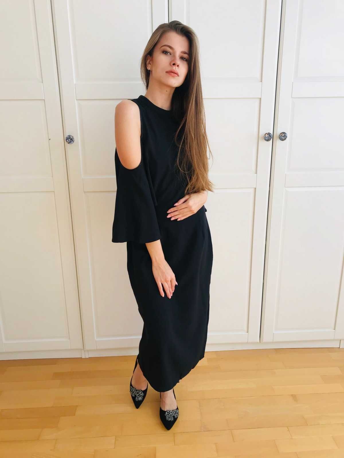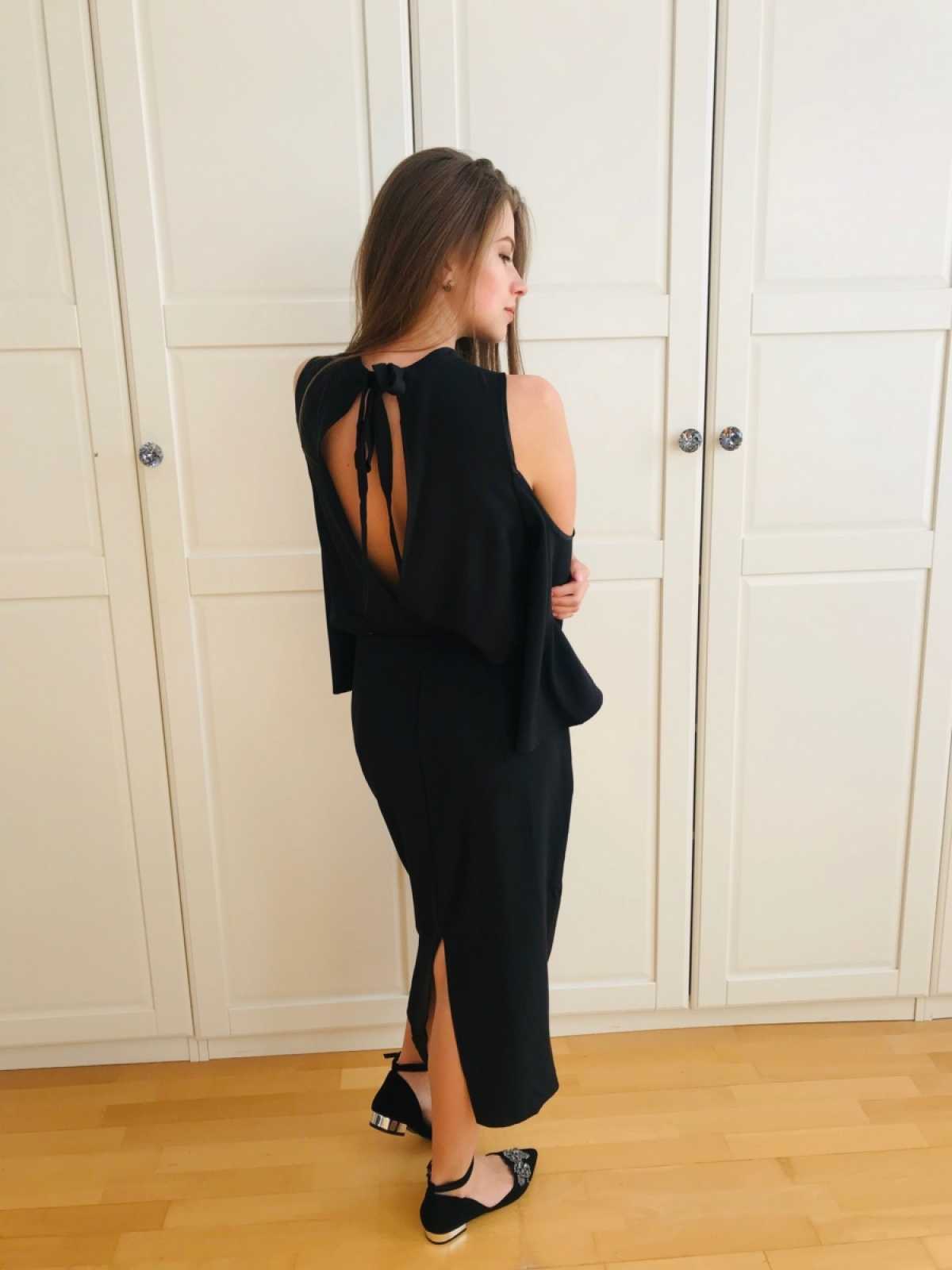 Sukienka z rozszerzanym rękawem 3/4, z wyciętymi ramionami. Odsłonięte plecy, wiązanie z tyłu. Wcięcie w talii. Idealna na wieczorne wyjścia.