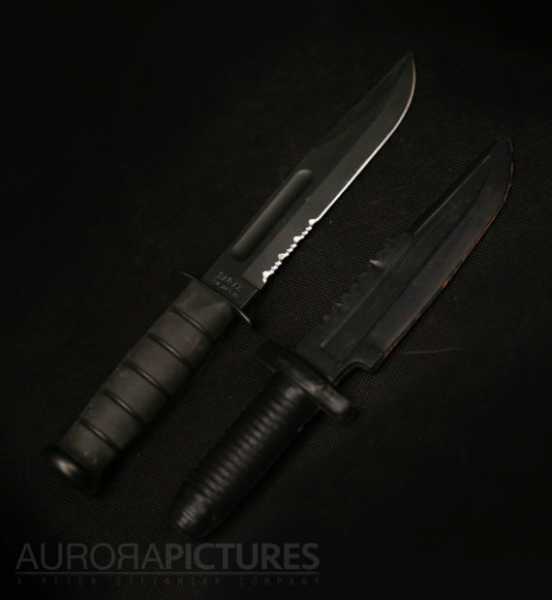Kiepskiej jakości plastikowy nóż wojskowy. Idealny do scen z planowanym dynamicznym montażem, gdzie ruch noża jest szybki. Nasz nóż zapewni bezpieczeństwo aktorowi w scenach kaskaderskich. Można stosować na zmianę z prawdziwym nożem wojskowym widocznym na zdjęciu, w scenach nie zagrażającym aktorom.