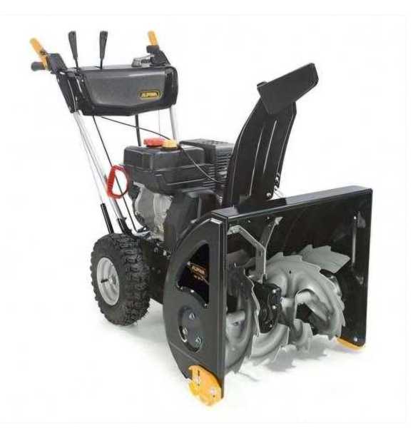Alpina AS 62 P to mocna, dwustopniowa odśnieżarka z silnikiem benzynowym o pojemności 212 cm3, zębatym świdrem stalowym, który poradzi sobie z każdym rodzajem śniegu i szerokością odśnieżania 62 cm. Wszystkie regulacje (zsyp, deflektor i prędkość) są wygodnie umieszczone na panelu wraz z przełącznikiem świateł LED, co umożliwia łatwą obsługę w warunkach słabej widoczności. 14-calowe koła Snow Hog zapewniają dobrą przyczepność, a posuw można regulować do 5 prędkości (+2 na biegu wstecznym).