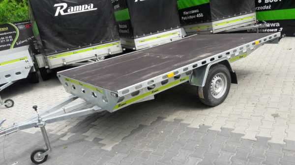Laweta, wygodna płaska platforma, idealna do przewozu większych, płaskich przedmiotów - łatwy załadunek wózkiem widłowym i szeroka przestrzeń ładunkowa, a przy tym koła pod spotem - które sprawiają że manewrowanie przyczepą jest bardzo proste